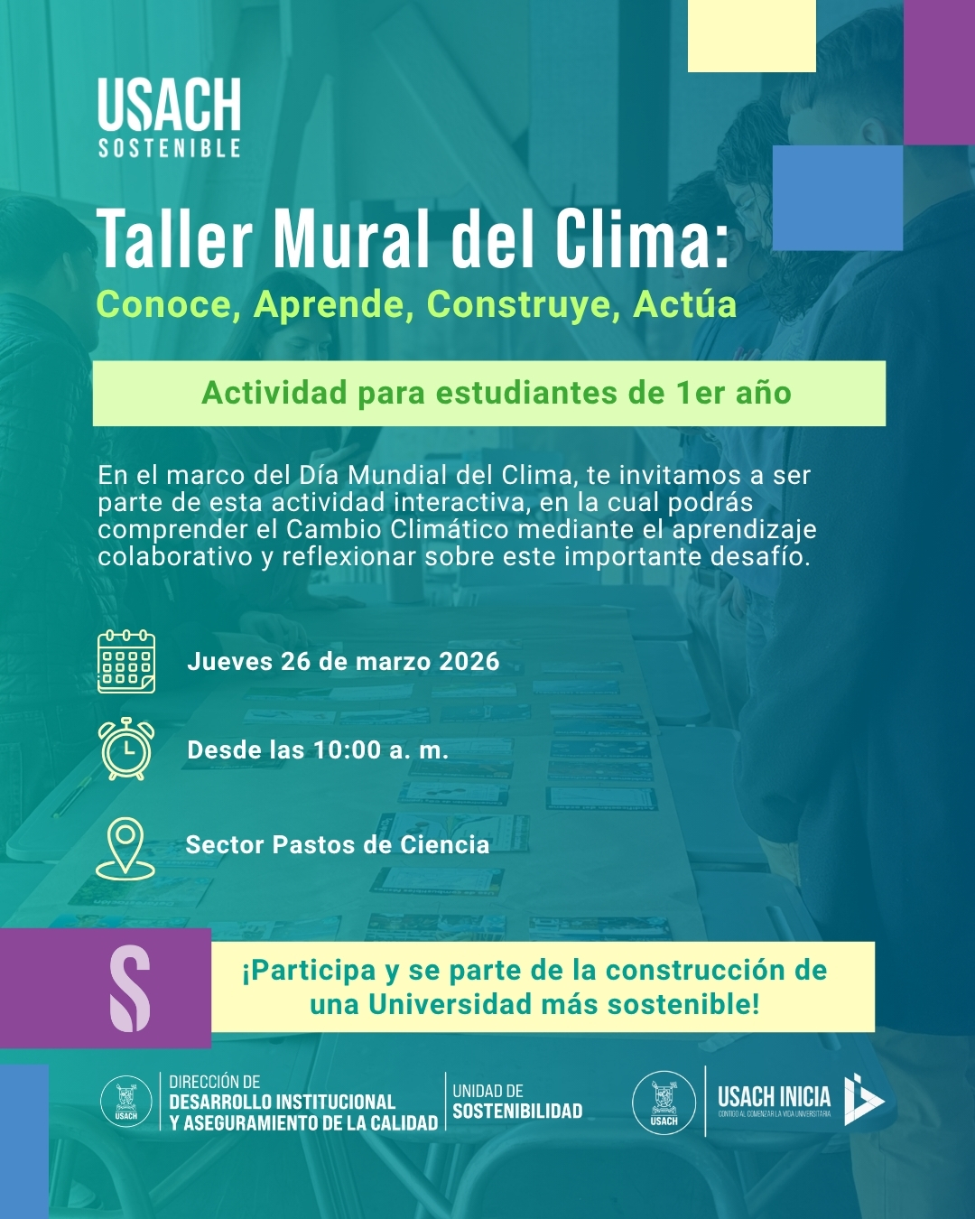 La Unidad de Sostenibilidad de la Dirección de Desarrollo Institucional y Aseguramiento de la Calidad invita a estudiantes nuevos de la Universidad de Santiago de Chile a participar en el taller “Mural del Clima”.